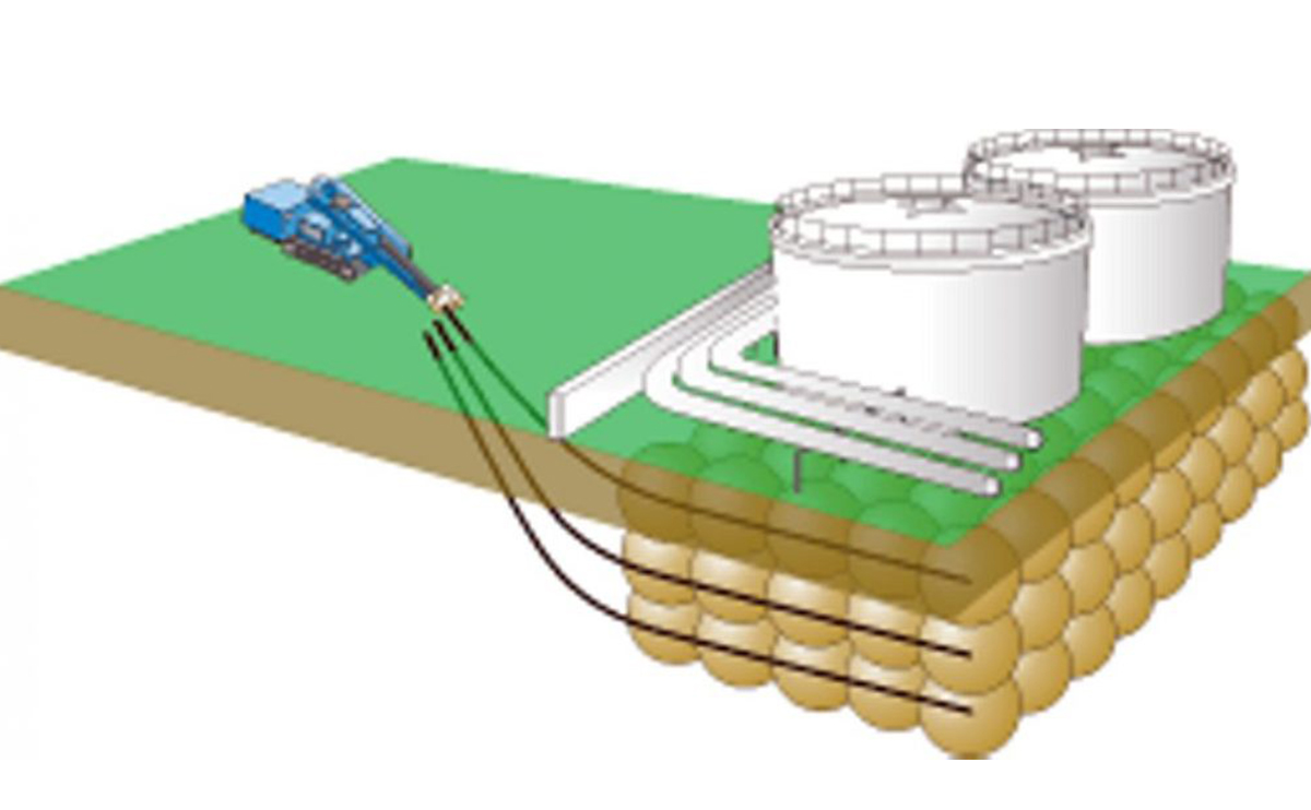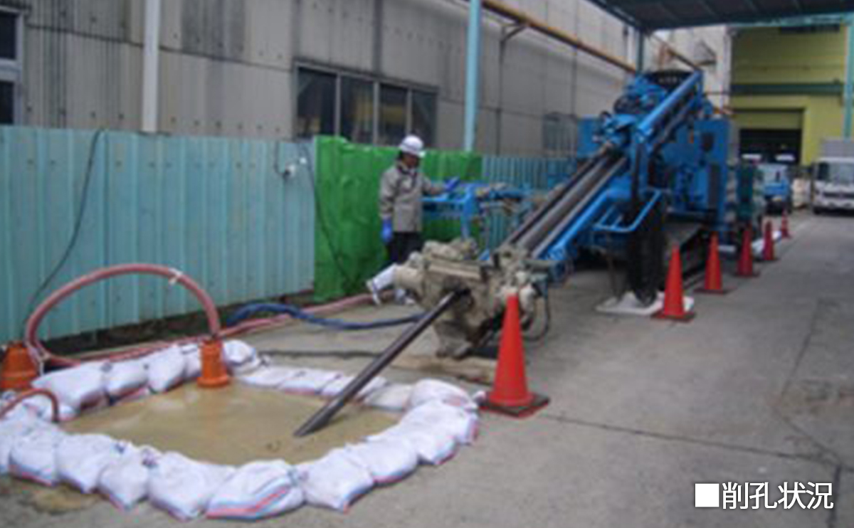 フリーダムーブ工法(自在ボーリング注入工法)は、従来の削孔は垂直・斜・水平と直線的削孔方式であったものを、3次元的曲がり削孔を可能にし、構造物の直下の施工を効率的に行なうことができる液状化対策に適した工法です。
