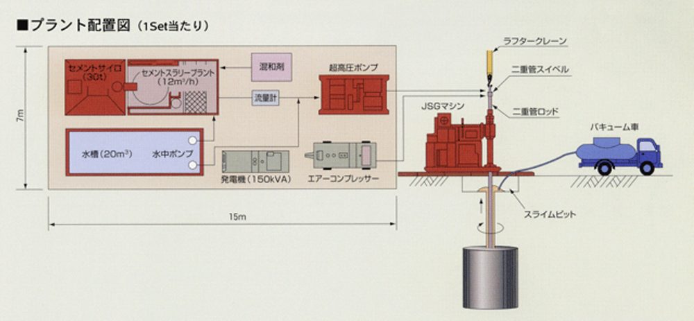 JSG工法は、圧縮空気を伴った超高圧硬化剤を、回転させながら地中に横噴射し地盤を切削し、スライムを地上に排出させながら円柱状の改良体を造成する工法です。
