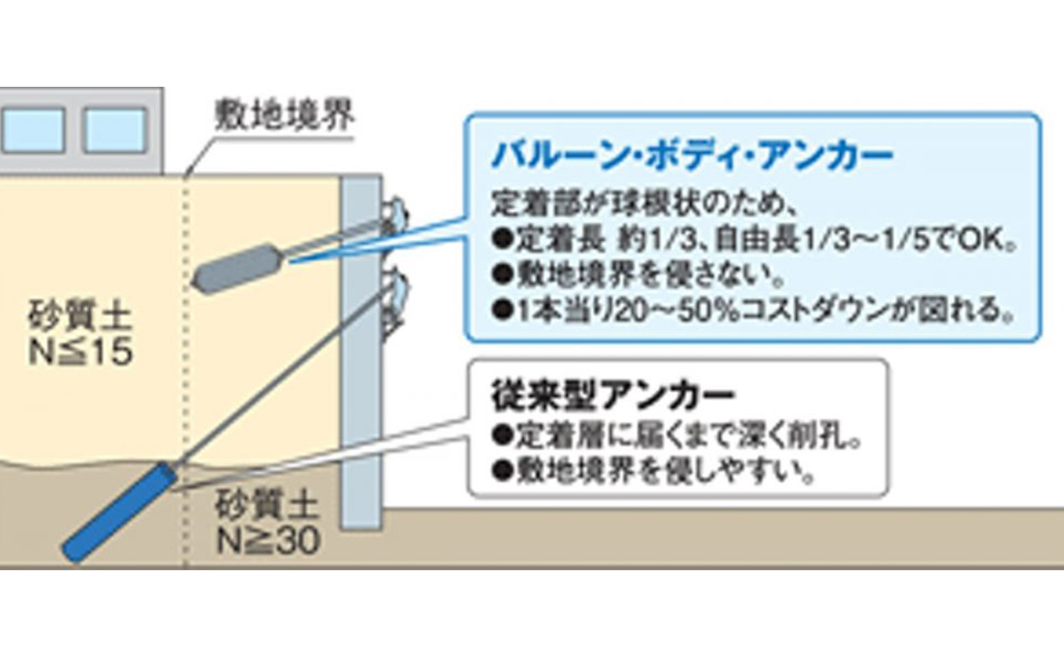 - 従来型アンカーに比べて定着長は約1/3、自由長は1/3~1/5で済むため、狭い敷地内でもアンカー体を収めることができます。