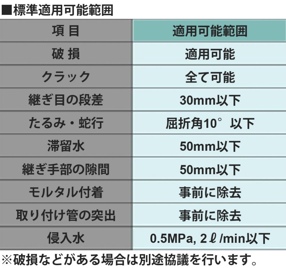 - 継手段差部、折れ角度、隙間、侵入水等のある現場にも適用可能です。