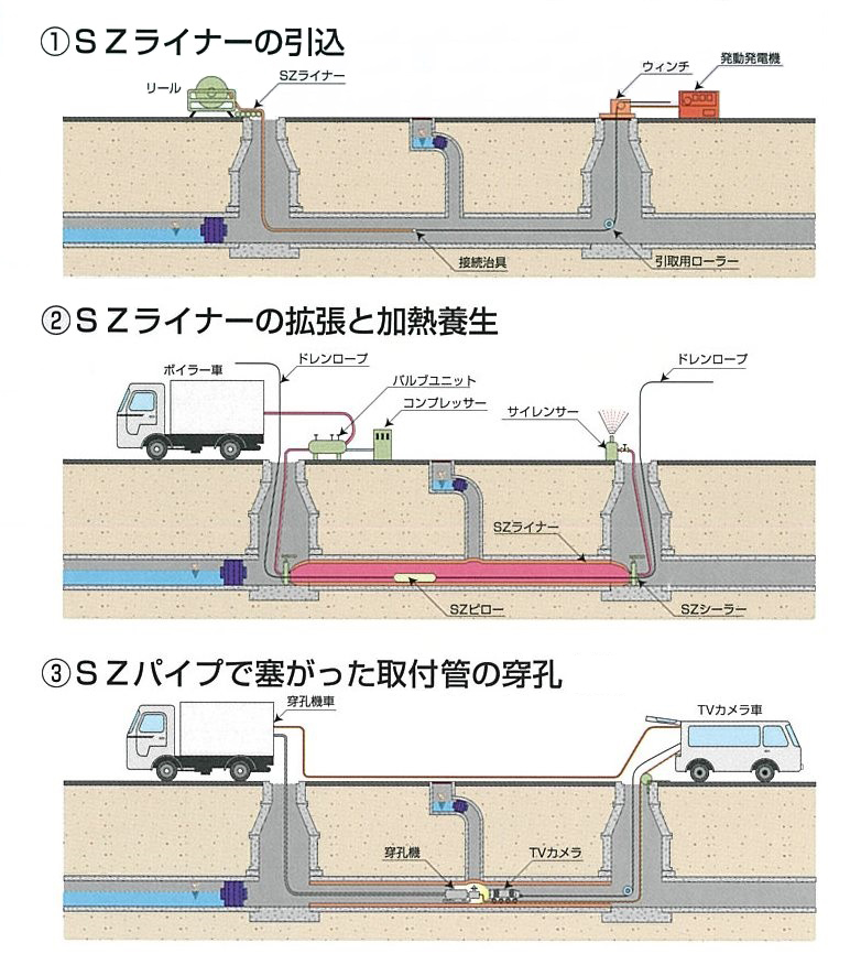 パルテムSZ工法は、マンホールを利用して既設管きょ内にSZライナーを引込み、空気と蒸気とでライナーを拡張・加熱して既設管きょ内に自立管を形成する工法です。