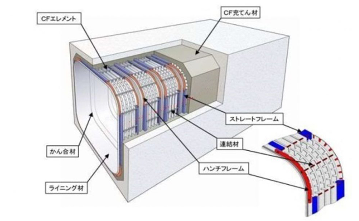 クリアフロー工法は、管きょの更生工法で、高密度ポリエチレン製ライニング材の背面の直線部とハンチ部に補強鋼材を連結材により一体化したCFエレメントを用いて、複合管を築造する管きょ更生工法です。