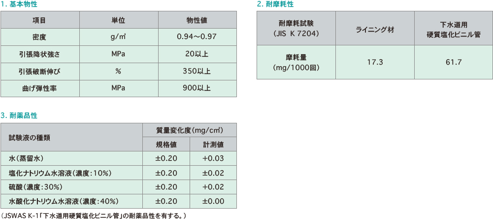 - 高密度ポリエチレン製ライニング材は、耐薬品性・耐摩耗性等の耐久性に優れます。