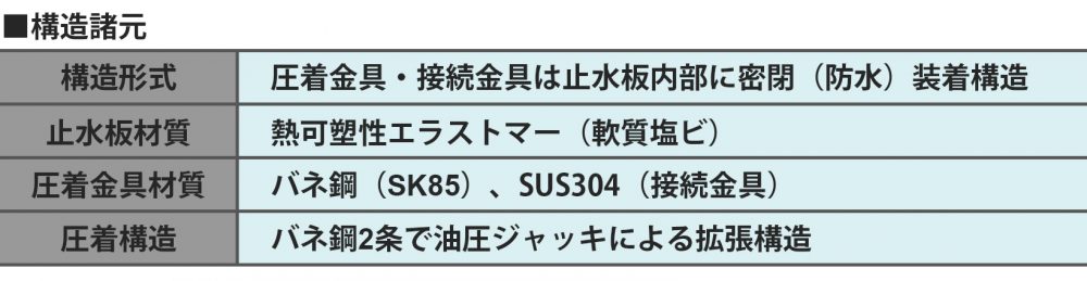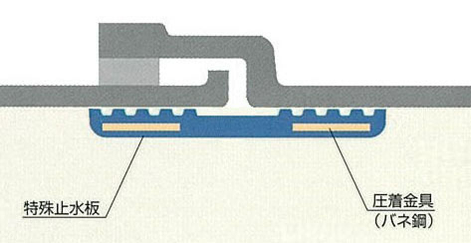 - 圧着用鋼材は、露出することなく水との接触を避けるため、全ての圧着用鋼材は止水板内に挿入・装着密閉構造となっています。