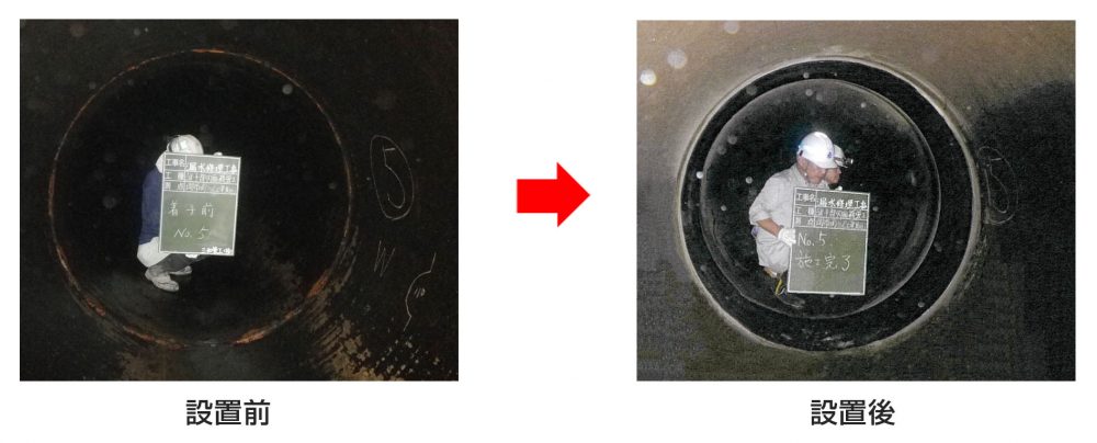 オーガスリング工法は、大口径管路継手部からの漏水や漏気を、路面を掘削することなく管路内から止水板を取付けて補修を行う工法です。施工後も管の挙動にも十分追従し、漏水・漏気防止性能に優れています。