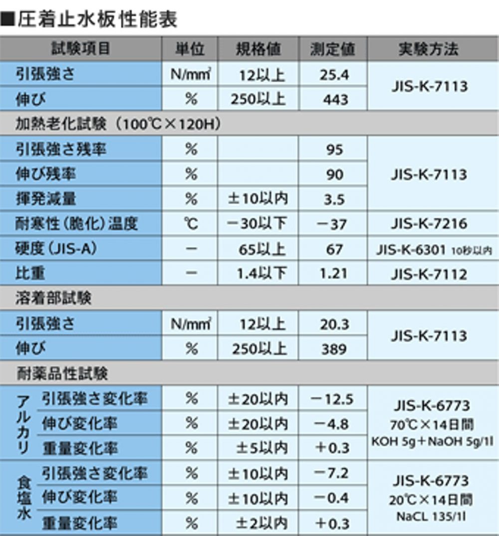 - 止水板は、耐薬品性に優れ、また厚生労働省令、JWWAの水質試験にも適合しています。