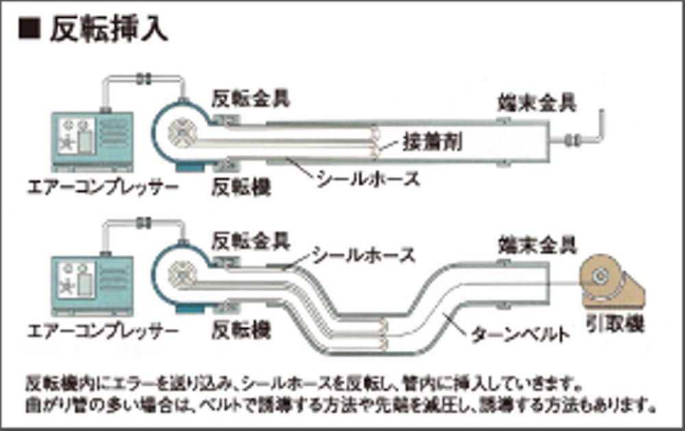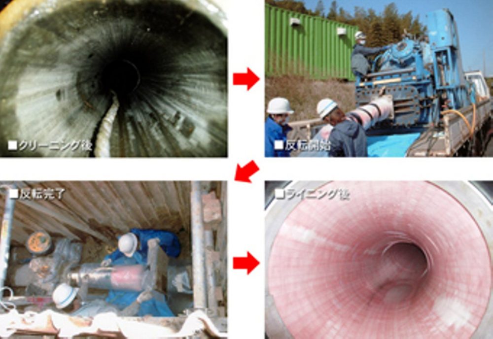 - 反転工法は挿入時の抵抗が小さく、2箇所の作業坑を掘削するだけで、短時間でロングスパンの施工が出来ます。