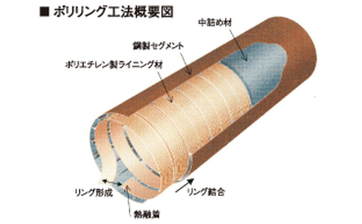 ポリリング工法は、耐久性・耐薬品性に優れた高密度ポリエチレン製の帯状ライニング材を、シールドトンネル内でリング状に成形・連結し、鋼製セグメントの二次覆工材として用いる薄肉二次覆工工法です。