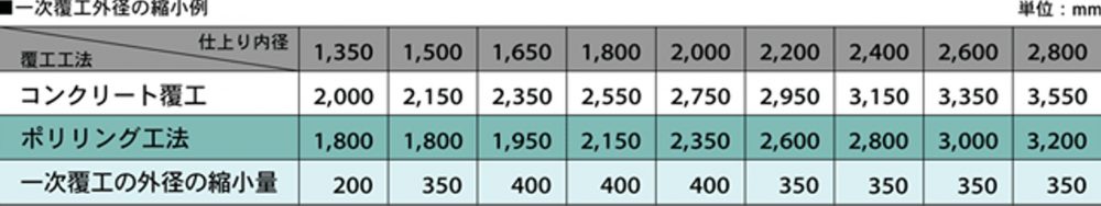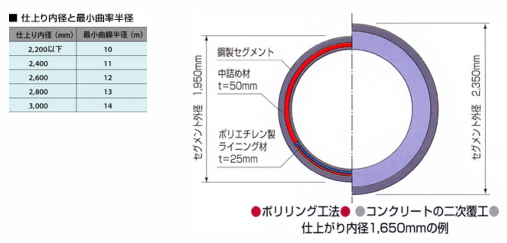 - 従来のコンクリートによる二次覆工に比べ薄肉のため、シールドの一次覆工径を200~400mm縮小できます。