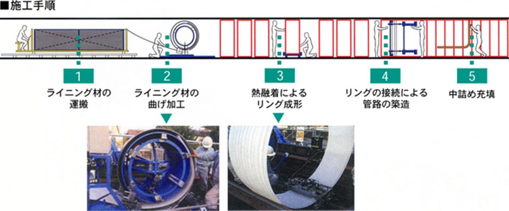 - 曲線部はテーパーライニング材を使用するため、急曲線部の施工も問題なく施工できます。