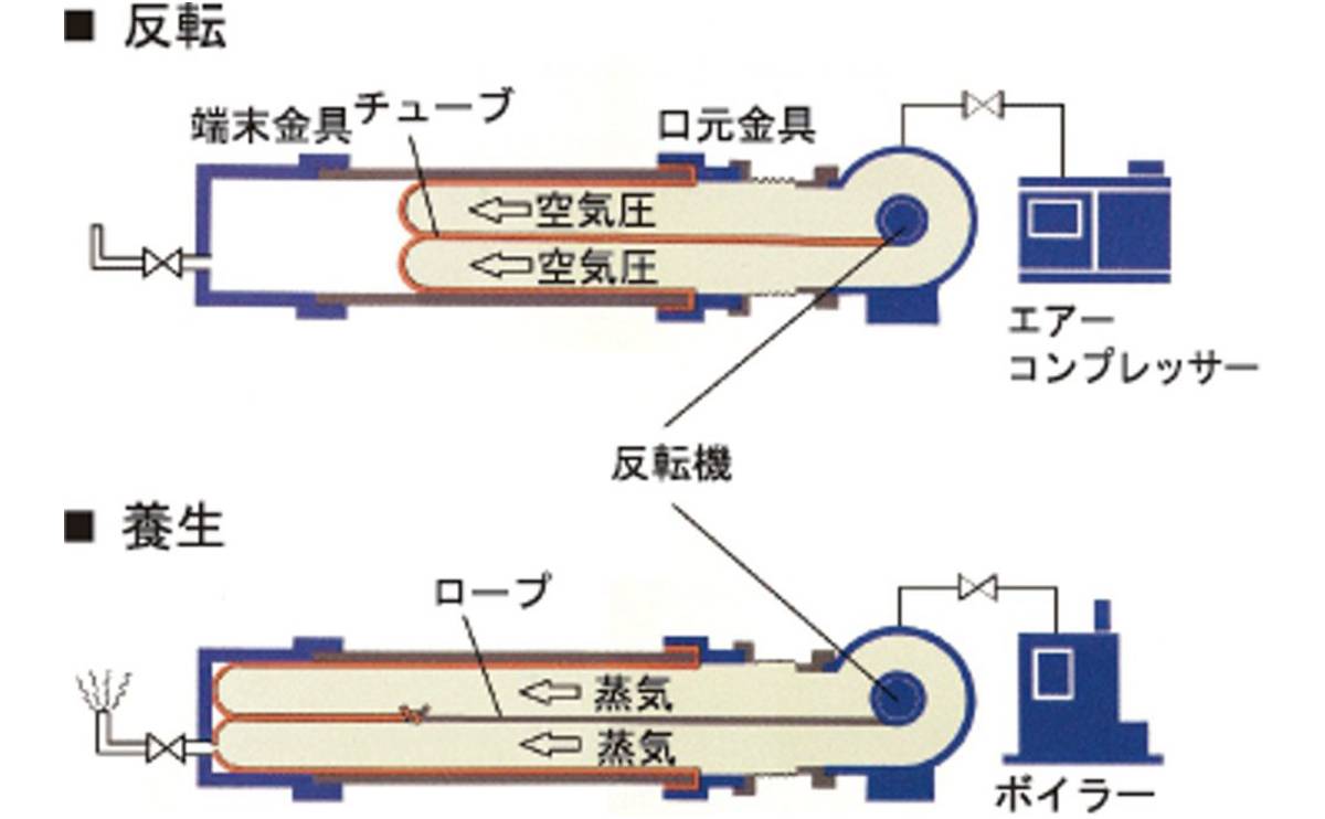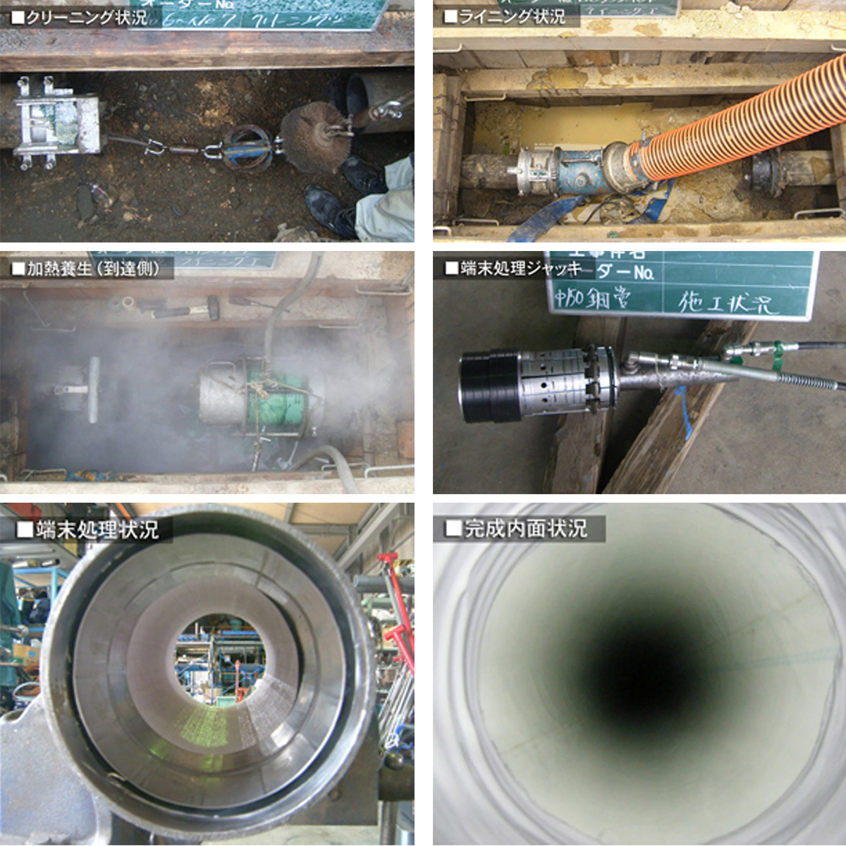 フェニックス工法は、エポキシ系接着剤を塗布した柔軟性のあるチューブを、ガス導管内に空気圧により反転挿入し、接着剤を加熱硬化させ、管内面に貼り付けてガス管を更生する工法です。
