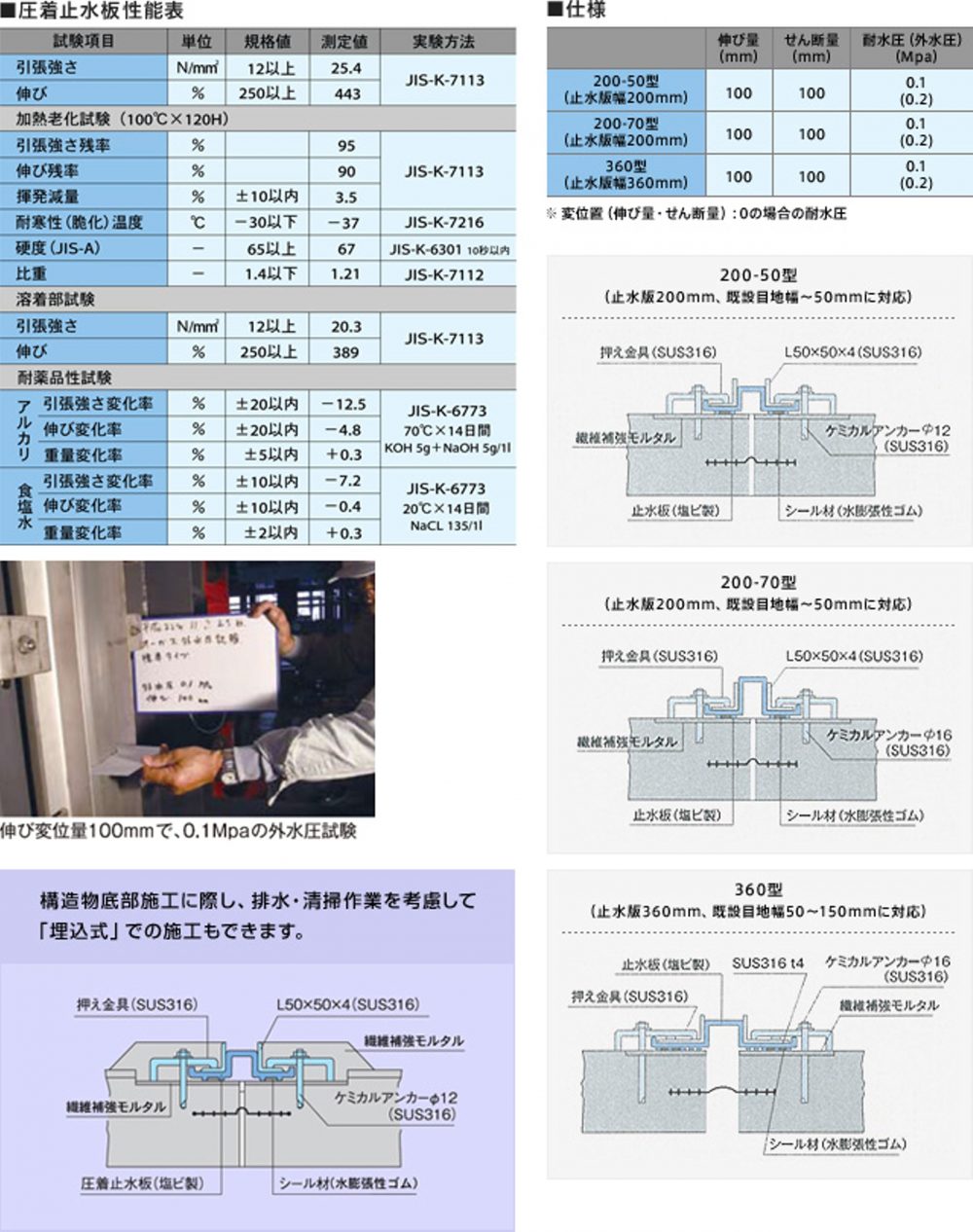 - 止水板の材質は、耐候性・耐薬品性に優れた軟質塩ビ製を、また押え金具、押えアングル、ボルト・ナット等はSUS316を使用しています。