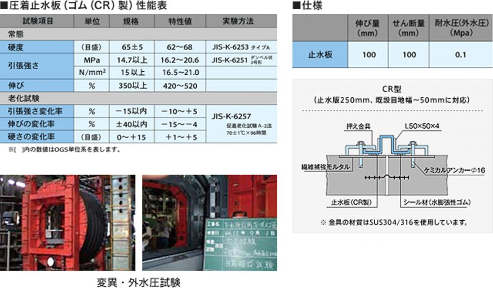 - 優れた止水性能を誇り、外水圧に対して0.1Mpaの止水性能を確認しています。