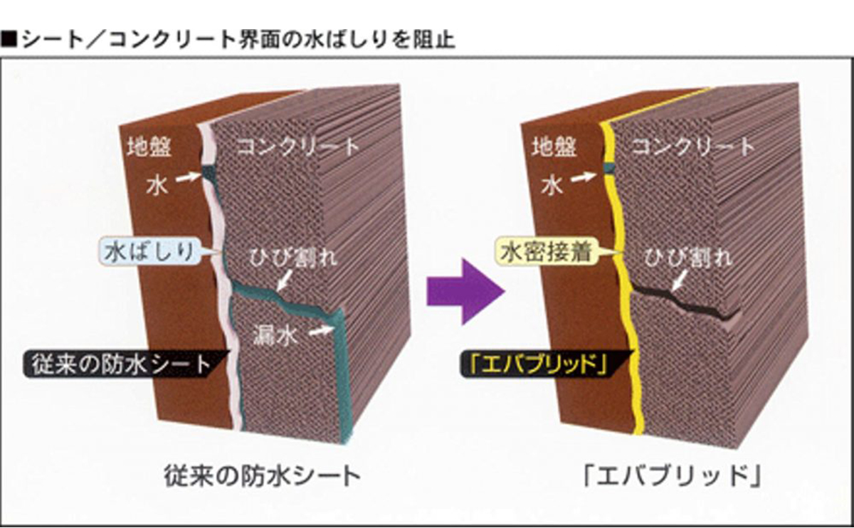 エバブリッド工法は、コンクリート面に化学的に強固に接着する特殊EVAシートを用いた先防水シート工法です。特殊EVA樹脂とコンクリートがイオン力で結合を促進し、高い接着性と優れた防水性を発揮します。その性能は、(財)鉄道総合技術研究所においても確認されています。