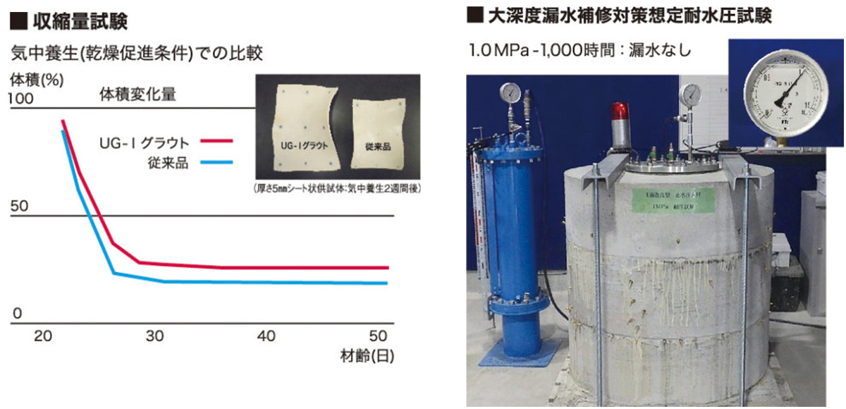 UG-Ⅰグラウト⼯法は従来の1液型ポリウレタン樹脂注⼊材に2種類の添加剤を加えることにより硬化物の収縮率が⼩さく抑えられ、⽌⽔効果持続期間の向上を図りコンクリート構造物の耐久性向上を実現しました。