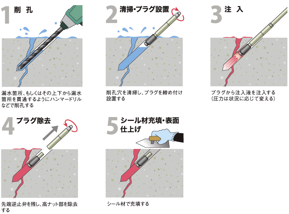 - 1液型ポリウレタン樹脂注⼊材に2種類の添加剤を加えることにより硬化後の収縮を抑え、再漏⽔や再注⼊のリスクを低減しました。