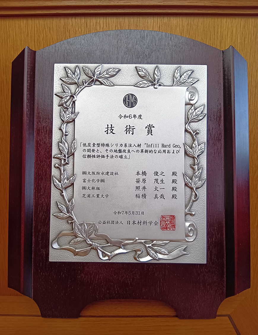公益社団法人 日本材料学会より低炭素型特殊シリカ系薬液注入用注入材Infill Hard Geo(インフィルハードジオ)が技術賞を受賞。